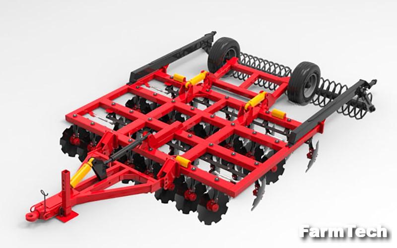 Прицепные с подъемными крыльями, трехсекционные: Исполнение дисковой бороны при котором основой орудия является ферма, к которой центральная секция устанавливается жестко а боковые (крылья) посредством шарнирных соединений. Благодаря данной компоновки орудие превосходно копирует даже самый сложный рельеф. Ширина орудий от 5 до 10 м.