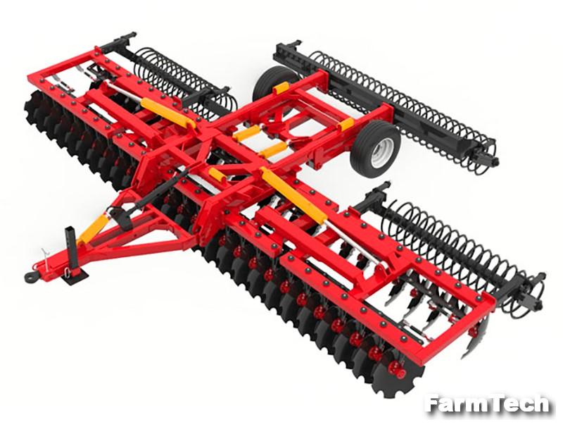 Прицепные с подъемными крыльями, трехсекционные: Исполнение дисковой бороны при котором основой орудия является ферма, к которой центральная секция устанавливается жестко а боковые (крылья) посредством шарнирных соединений. Благодаря данной компоновки орудие превосходно копирует даже самый сложный рельеф. Ширина орудий от 5 до 10 м.