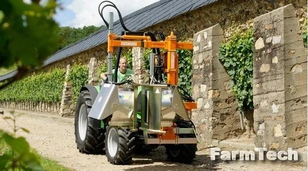 Легкая и прочная чеканочная машина для виноградников подсоединяется к трактору спереди.