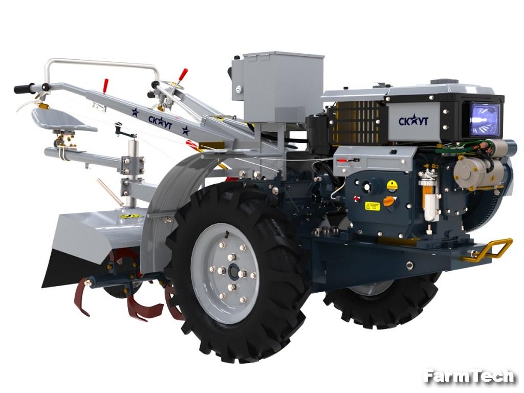 Тяжелый мотоблок СКАУТ 101DE с несколькими валами отбора мощности: шестеренчатым, шлицевым и двумя ременными (шкивы на двигателе и редукторе). Мощность дизельного двигателя – 11 л. с. К этой машине подходит минимум 13 видов навесного оборудования.