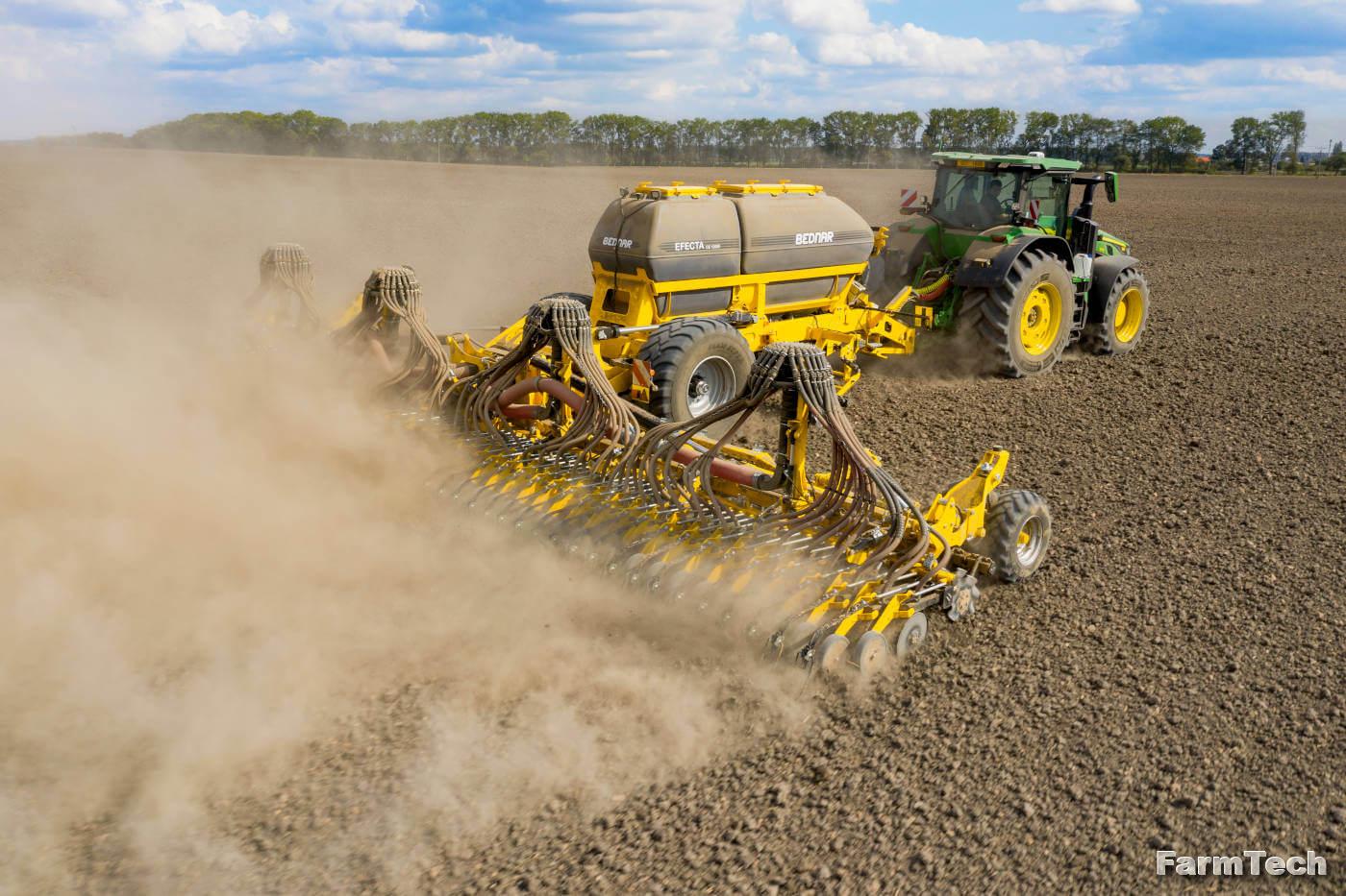 Универсальная широкозахватная сеялка с возможностью подготовки почвы за один проход, рассчитанная на максимальную дневную производительность.