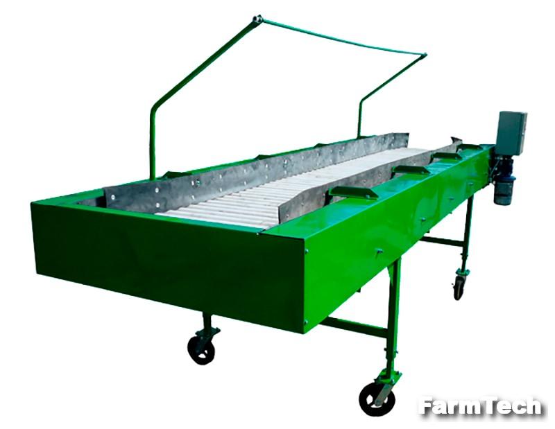 Этот механизм позволяет вести визуальный контроль не только за качеством картофеля, но и других корнеплодов. Рабочая площадь полотна делится на три части, в средней идет поток продукции, а в боковые отсеки откладывают некачественный продукт. Боковые отсеки в окончании имеют устройства для закрепления сеток (мешков). Регулировка высоты инспекционного стола и возможность установки освещения поможет сделает сортировку наиболее комфортной и эффективной. У данного стола установлен частотный преобразователь для регулировки скорости полотна.